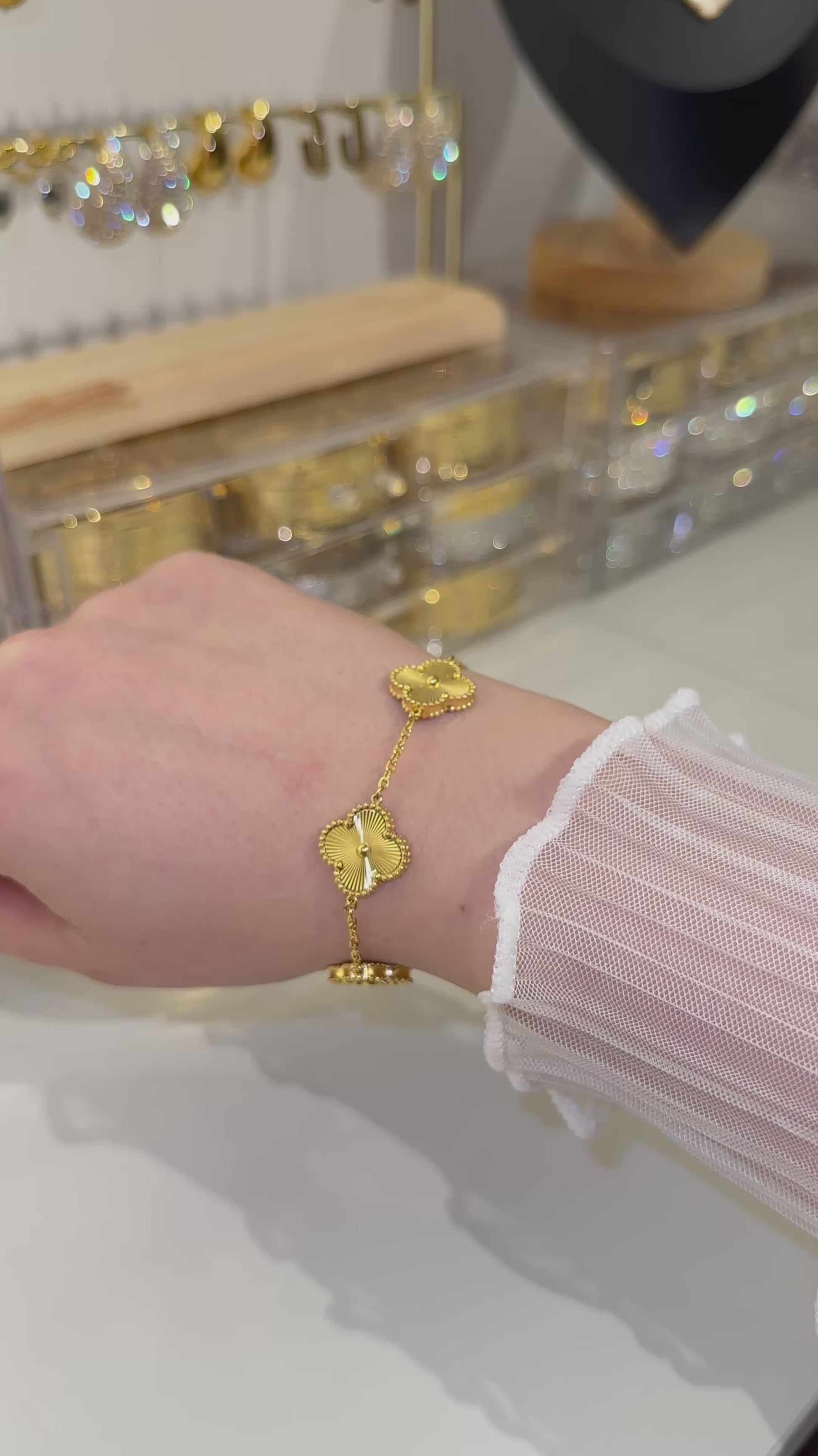 Stainless steel waterproof, hypoallergenic non tarnish four leaves bracelet.