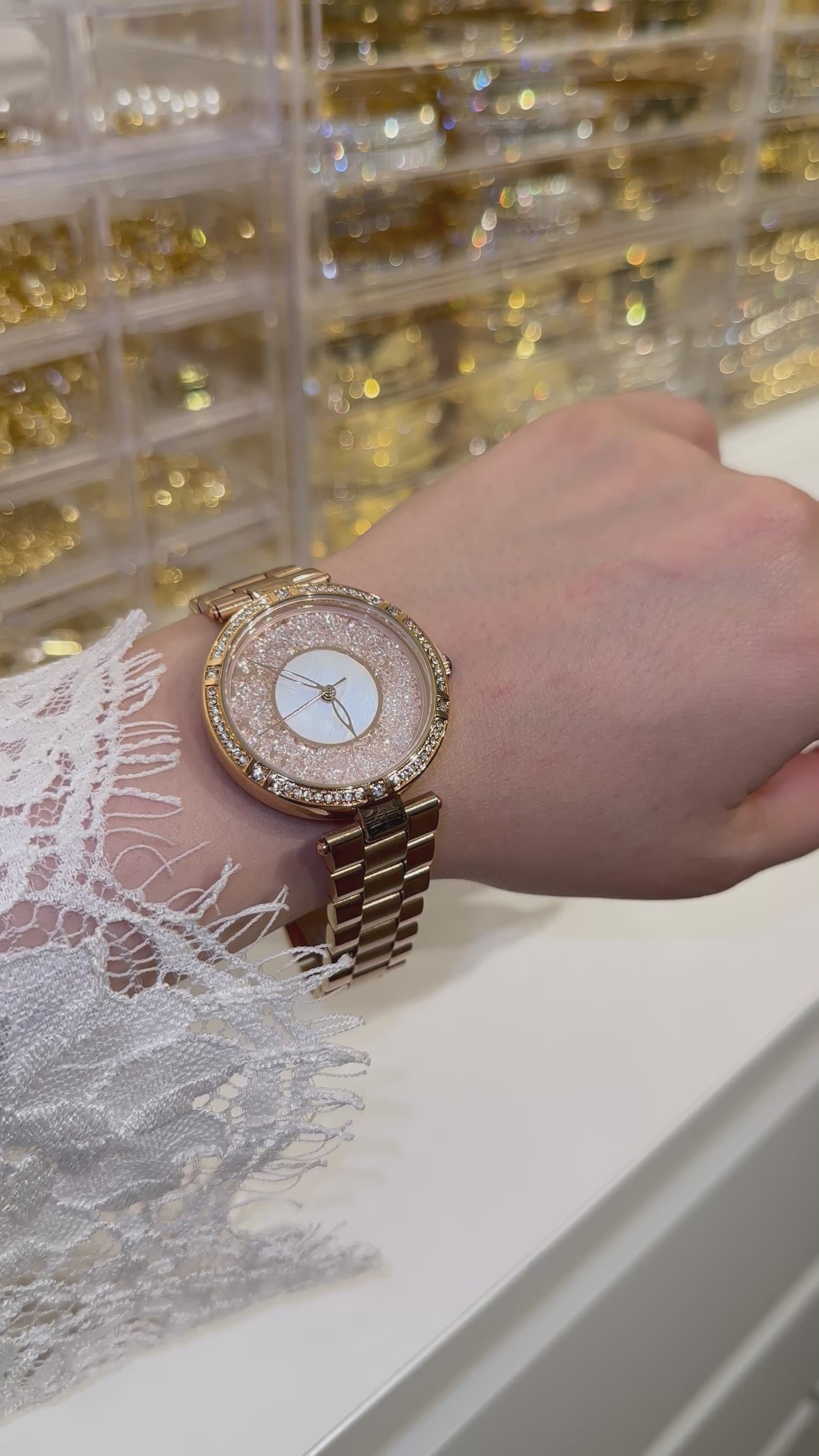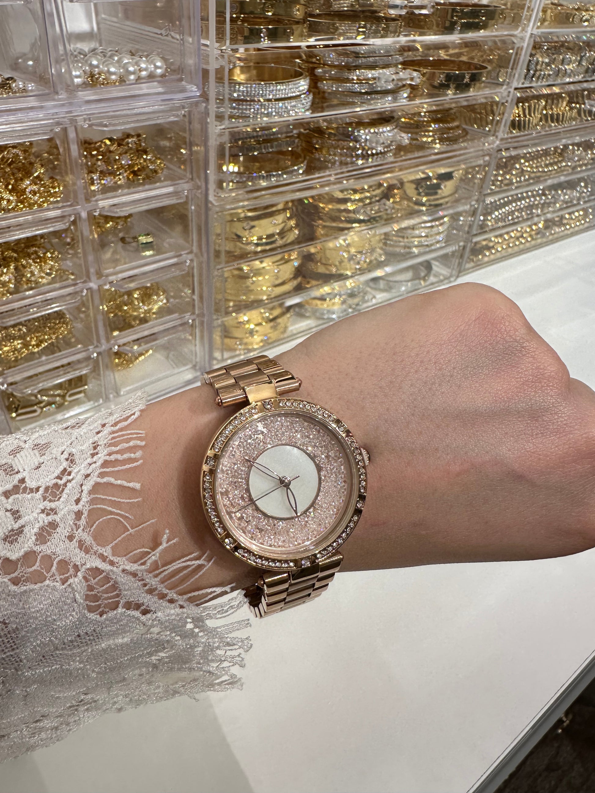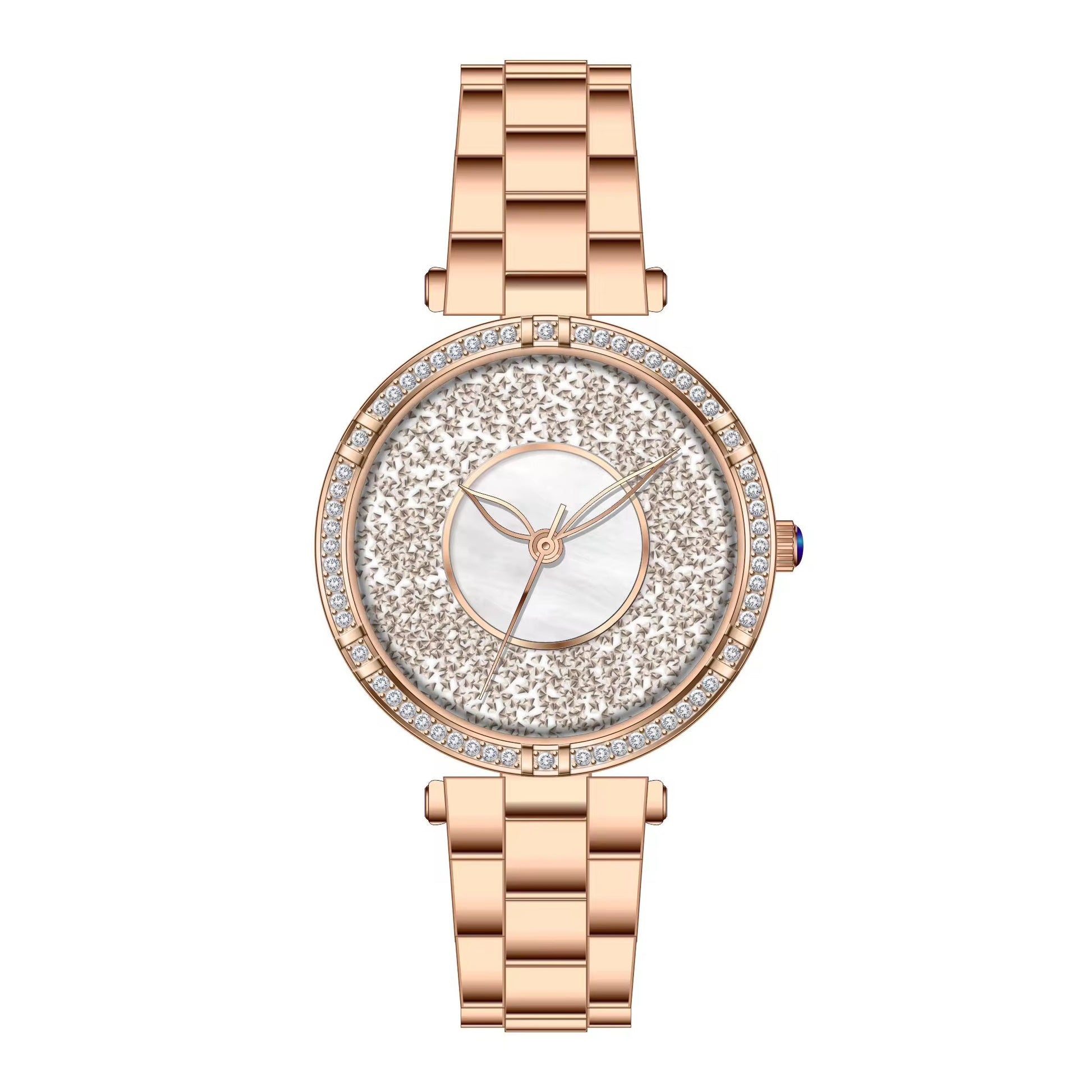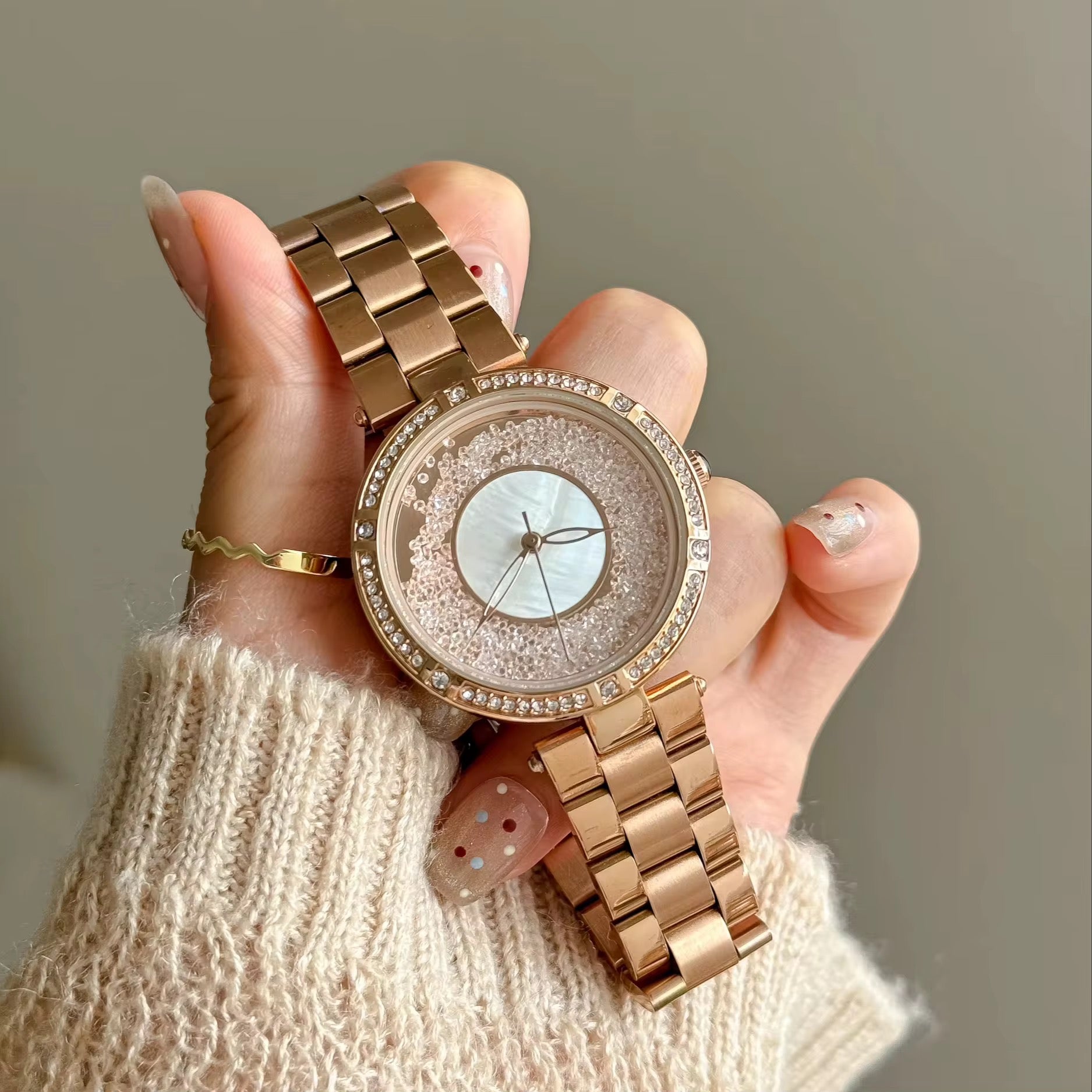 Rose gold stainless steel waterproof lady watch.